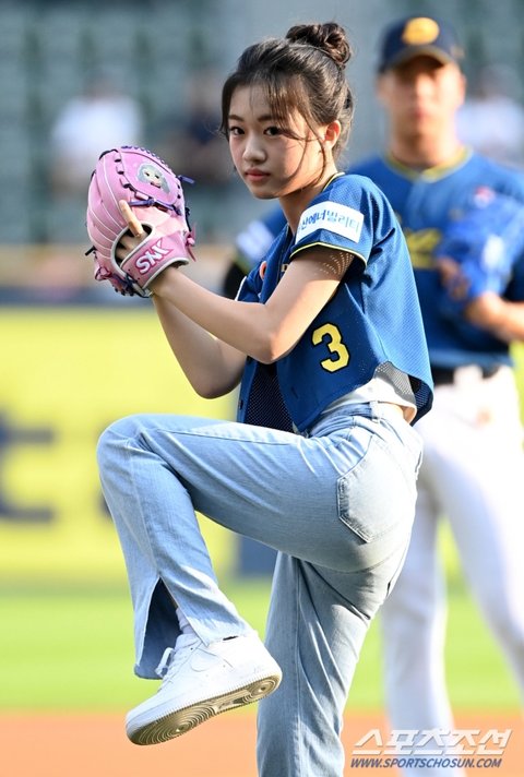 3일 잠실야구장에서 열린 키움과 두산의 경기, 크리에이터 나하은이 시구를 하고 있다. /2024.08.03/