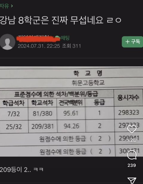 휘문고라는데 수학 전교 209등이 2등급임 ㄷㄷ…. ㄹㅈㄷ네