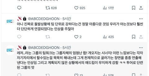 첫줄에 멕이는거봐 ㅋㅋㅋㅋㅋㅋㅋㅋㅋㅋ각자 개인플레이한다는걸 저렇게 ㅋㅋㅋ
