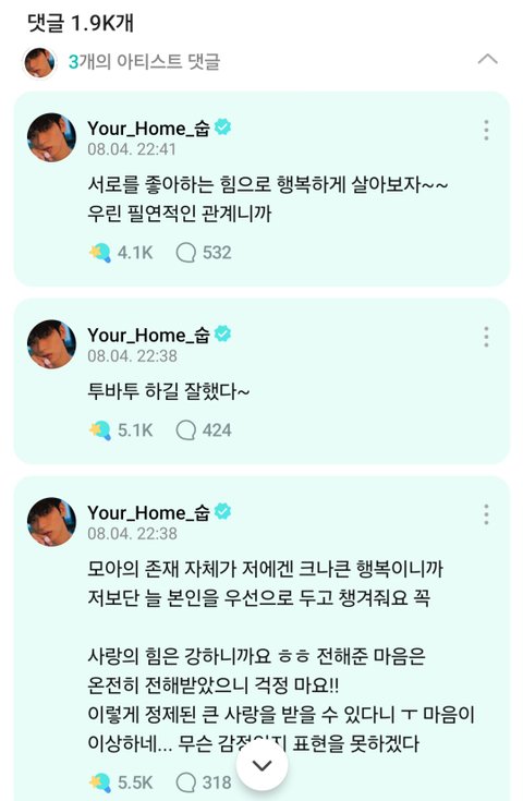 원래부터 모아들 많이 좋아하는 거 알았지만 오늘따라 그게 더 잘 느껴지네 필연이라니.. ㅜㅜ 투바투랑 모아가 인연이긴 하지