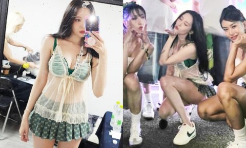 "뒤죽박죽"이란 글과 함께 올라온 사진 중 유독 한 사진이 눈에 띈다. 바로, 초록색 수영복에 안이 다 비치는 얇은 상의를 걸친 사진. 공개된 사진은 모두 선미의 다양한 무대 근황을 담고 있는데, 해당 의상은 선미가 '워터밤' 행사에 갔을 때 입었던 옷이다.