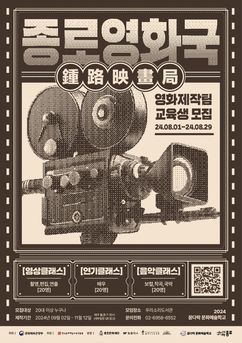 <프로그램 안내>- 사업명 : 2024 꿈다락 문화예술학교 <종로영화국>- 일정 ‣모집 : 2024. 8. 1.(목) ~ 8.29.(목) ‣교육 : 2024. 9. 2.(월) ~ 11.12.(화) 19:00~22:00- 장소 : 우리소리도서관- 대상 : 연기, 영상, 음악을 사랑하는 성인 누구나- 신청 : https://forms.gle/M8JtJHiL5KdNhg5K7