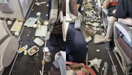 A씨가 함께 공개한 사진에는 기내식으로 제공된 음식과 식기, 종이컵 등이 복도와 좌석 밑으로 엎어진 모습이 담겼다.