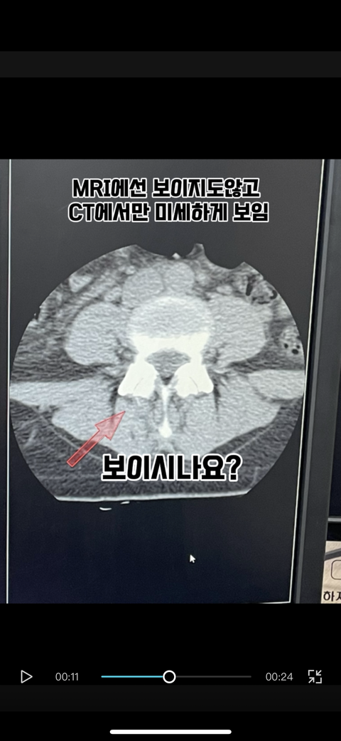 xray,mri에선 아예 안보이나 CT에서 미세하게 보인다는 소견, 위치가 근육 깊숙히 있고 크기가 작아 제거하면서 근육을 많이 손상시킬수 있다는 소견에도 불구하고 수술하겠다고 입원했지만 젊은 나이에 수술하면 배보다 배꼽이 클수있다는 척추 전문의 말에 수술취소하고 퇴원했습니다