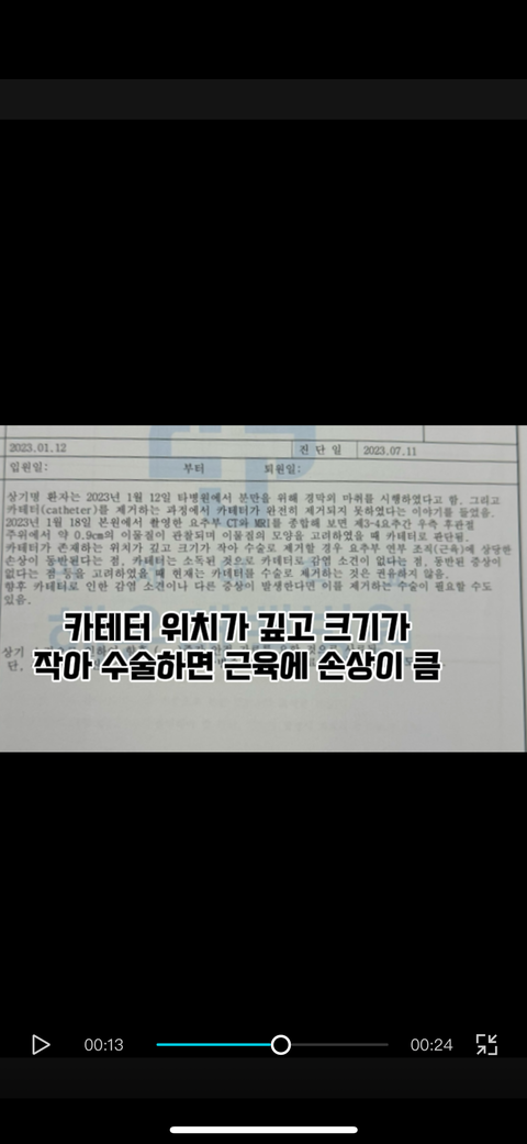사고내용은 의사가 무통주사를 다른 위치(근육)에 잘못 삽입했다가 제거하면서 줄이 끊겨 몸속에 남게되었습니다