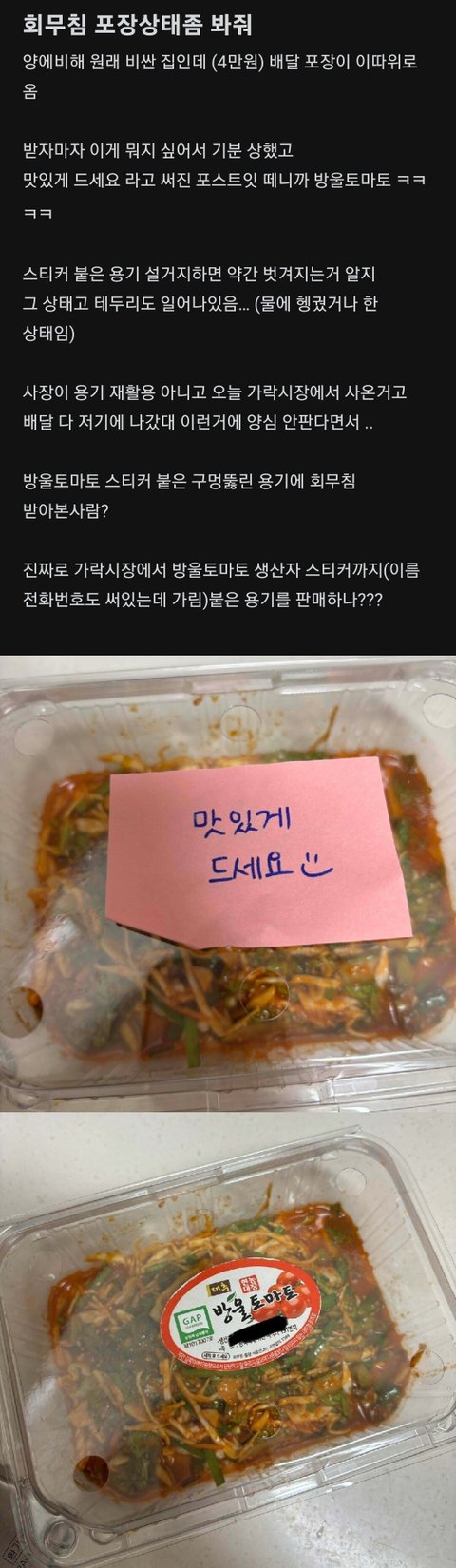 진짜 장사 개판으로 하네 집에서 저런 용기 재활용하는데 식재료는 담지만 식품은 못 담겠던데 사장은 지나 지 자식들이 먹을거여도 저기에 담아서 먹을건가?