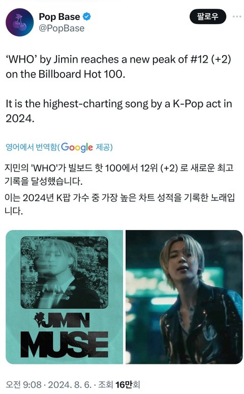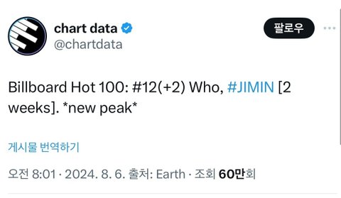 지민 WHO 이번주 빌보드 핫백 12위 (+2)