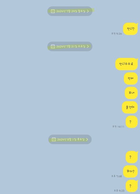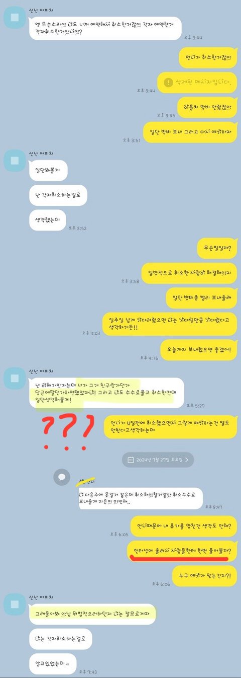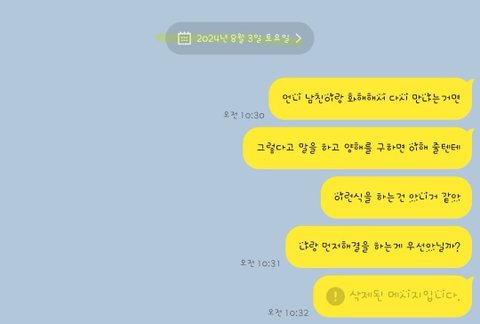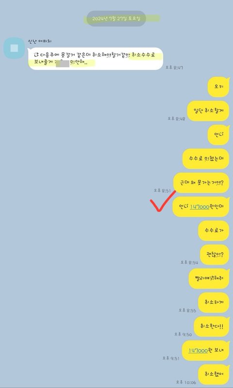 여행 5일전 B가 일방적 여행취소 통보수수료보내준다고 미안하다는 말만 남기고 일주일 잠수일주일동안 카톡 , 전화 다안받고 카톡도 읽씹함B가 운영하는 센터로 전화직원에게 원장님과의 부재로 연락요청 전달 후 바로 카톡 옴