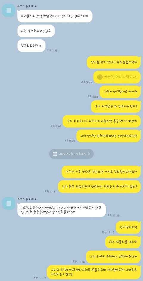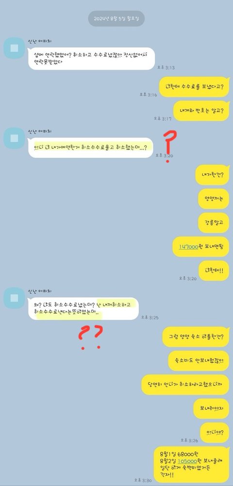 일방적통보 취소와 수수료를 보내준다고 해놓고 본인예약건만 취소해서 수수료를물고나머지 2일치 수수료는 제가 무는게 맞는건가요?각자 취소하고 낸다는말이 무슨말인지 저는 이해가안가는데 여러분들이 보시기엔 어떠신가요?인터넷에 글도 올리라했고 법대로도 하라고하니 의견수용해서 진행하려고합니다.