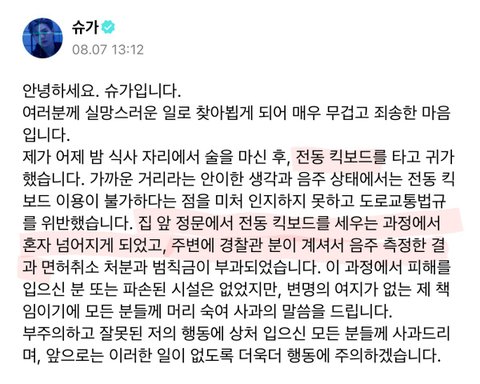 + 범칙금 받았다고 본인이 말했고 밤에 올라온 하이브 공지에서도 범칙금 받아 끝인줄 알았다고 했으나 경찰이 범칙금 발부한 적 없다고 함