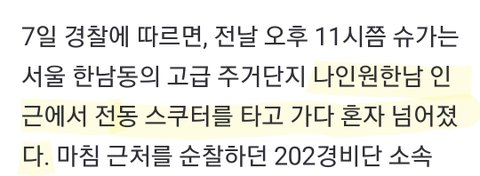 전동 스쿠터 타고 집가던중 길바닥에 드러누운걸 근처 경비원이 발견하고 경찰 신고해서 주취자 인계된걸