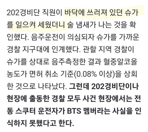 경비직원이 바닥에 쓰러져있는 슈가를 발견하고 지구대로 인계해서 거기서 음주측정한것