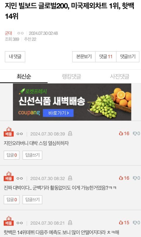 박지민 찬양할때 베플조작까지해가며 영업하는 쓰갤줌 놀이터