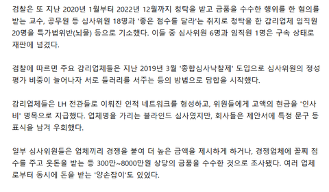 지난해 8월 , LH 출신 직원들을 채용한 전관 업체가 입찰비리를 저질렀다는 의혹을 수사해온 검찰이 거의 1년 만에 수사 결과를 발표 입찰 담함 사건과 뇌물 수수 사건을 합쳐 이번 수사로 모두 68명이 재판에 넘겨짐.감리엄체 17곳과 임직원 19명경기 양주시와 화성시, 울산 등 전국 각지의 공공.임대 아파트와 병원, 경찰서 등 주요 공공건물에 대한 감리 업무가 대상.업체들끼리 낙찰자를 미리 정해놓고 나머지는 들러리를 서주는 수법이었는데 이렇게 타낸 계약금만 5,740억 원