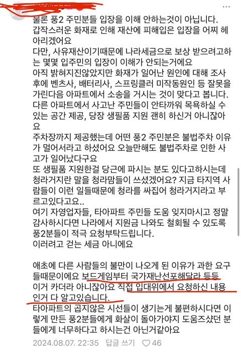 아파트 살아야 이렇게 혜택받을수있는건가 생각이 많아지네요 빌라에 살던분들이나 단독주택 상가 이런곳에 살던분들이 화재가 크게나서ㅠ 길거리에 나앉게 생겼어도ㅠ이렇게 학교강당열어서 텐트쳐주고 지원금넣어주고 생필품 넣어주고 공무원지원해주고 하지는 않잖아요.. 너무 당당해서 어이없는데 일단 사비로 하고 구상권 청구하셔야지 무슨.. 폭우나 지진난것도 아니구