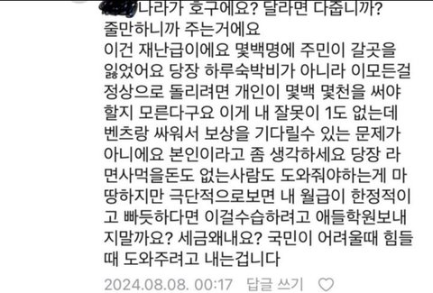 세금으로 지원했던 선례가 남아 자꾸 이렇게 세금타령만 하는 겁니다. 고마운 줄 모르고 본인들이 낸 세금 돌려받는다는 생각이나 할 테고요. 아파트가 단체로 벤츠에 소송을 걸든지, 구상권 청구를 하든지 해야하고 스프링클러는 왜 작동 안했는지도 밝혀내야죠. 물에 빠진 사람 건져놨더니 보따리 내놓으라 한단 말이 딱 어울립니다. 사람들이 염치가 좀 있어야지. 어이가 없네.