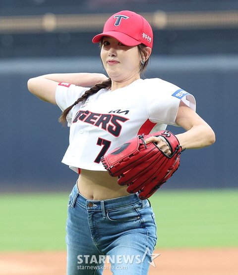 배우 강예원이 KIA 승리기원 시구를 하고 있다.