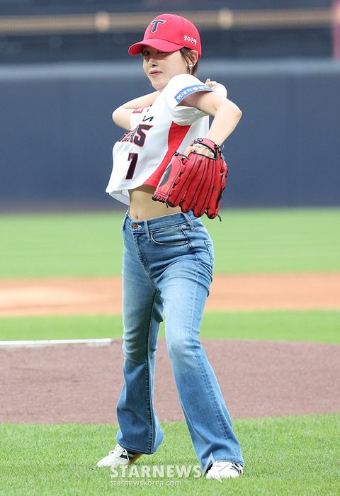 배우 강예원이 KIA 승리기원 시구를 하고 있다.