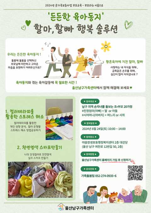 ○ 일시 : 2024년 8월 24일(토) 10시-14시○ 대상 : 남구지역 손자녀를 돌보는 조부모 20가정○ 장소 : 야음장생포동행정복지센터 2층 대강당(남구 여천로12번길 50, 2층 대강당)○ 내용 : 컬러테라피를 활용한 스트레스 해소, 천연염색스카프만들기○ 신청 : 홈페이지신청(https://ulsan.familynet.or.kr/web/lay1/program/S1T304C450/recruitReceipt/view.do?seq=168229)☎ 문의 : 가족돌봄팀 274-0935~6