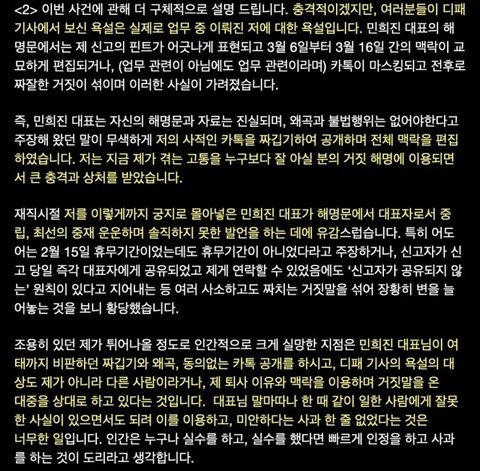 내용 요약하면 민희진이 온대중을 상대로 거짓말 하고있다고 함 그리고 이 글도 짜깁기 거짓말이라고 민씨측에서 주장한다면 추가조치를 취하겠다고 함
