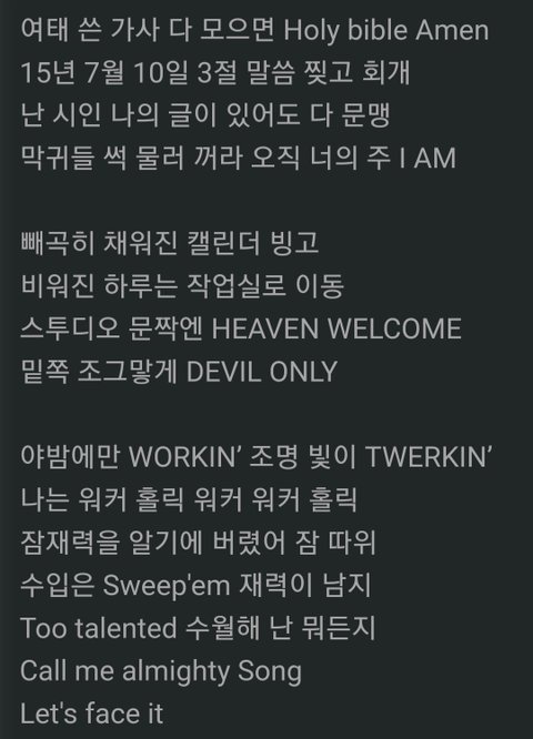 송민호 여혐 가사 공식적으로도 사과했고 노래 가사에도 넣어서 공연할 때마다 부르는 중임. 누구처럼 자기가 잘못해놓고 거짓말 하는 게 아니라 ㅇㅇ 암이들아 알겠냐??