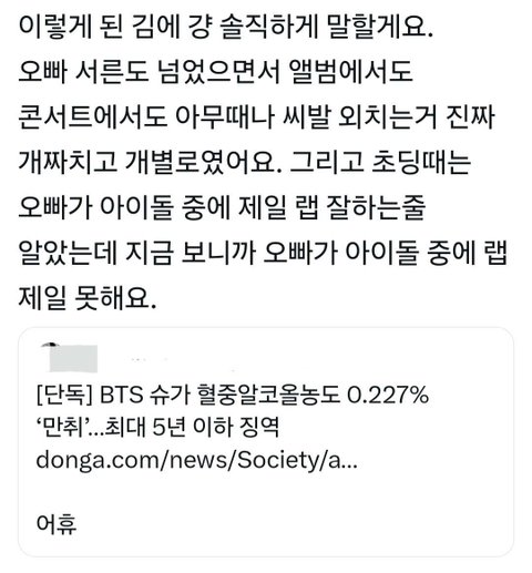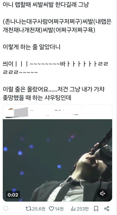 아니 콘서트에서 간지나려고 작고 짧게 씨12발 하는것까지는 그렇다치자..근데 걍 씨이이이바아아알!!! ㅇㅈㄹ처하니까 ㅈㄴ웃김 근데 사람들 말하는게더웃김 개처웃김ㅠㅋㅋㅋ 아미들은 저걸 진심으로 좋아한거야...? 걍 짜치는데