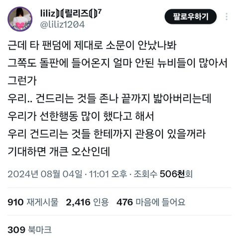 + 지운듯...쟤네한테 소문아직 안 났나본데 우리한테 찍히면 끝까지 밟아버리네 어쩌네 ㅇㅈㄹ해서 인용에 조롱 달리고 장난아니었음 싸물라고 좀