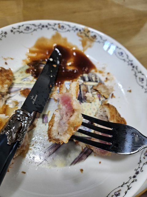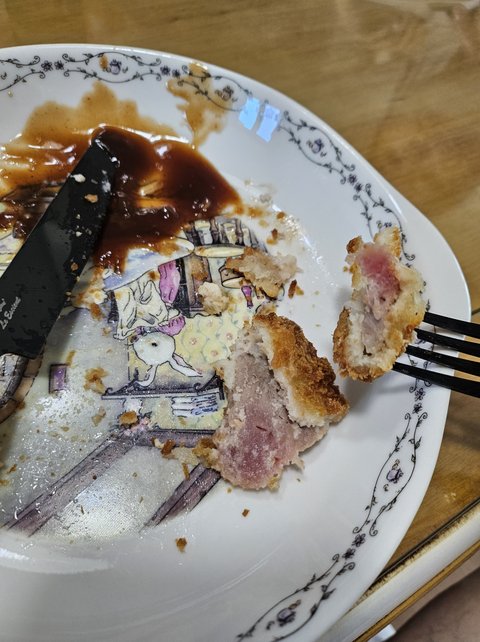아이들과 얘기하면서 나이프 쓰는거 봐주고 한다고 확인 안하고 몇조각 먹다보니....고기 색깔이 빨갛더라구요