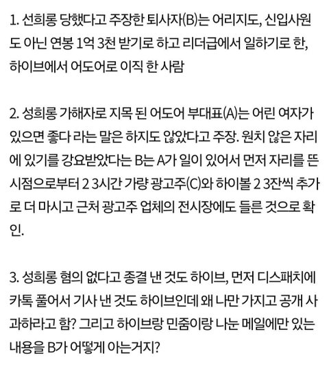 ㅋㅋㅋㅋ아니 성희롱은 인정된것도 아닌데 왤케 성희롱성희롱 하는거임? 직원이 주장한 성희롱도 어린여자라는 표현 하나뿐이고 그 부대표는 부인했고 하이브는 내사 후 혐의없음으로 종결했고 직원은 경찰에 신고도 안했고 대체 뭘 근거로 성희롱을 사실화함?