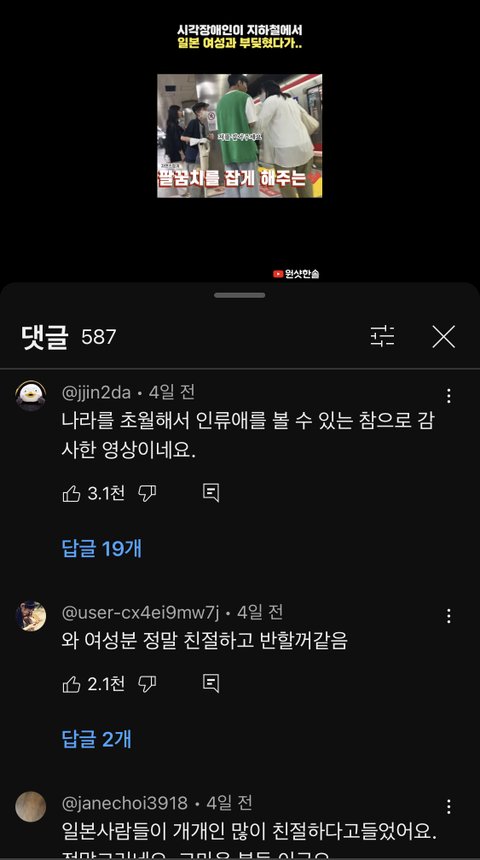 유명한 한국 시각장애인 유튜버가 일본 여행을 간 영상을 올렸는데 대다수의 일본인들은 유튜버인지도 모르고 도와주려고 팔꿈치 잡아라, 같이 가주겠다며 선의를 베푸는 반면 일본에 있던 한국 관광객들은 팬이라며 사진찍어달라고 하고 사진 찍어주니까 일 끝났다고 그냥 가버림 심지어 무단으로 사진찍는 한국인들도 있었음