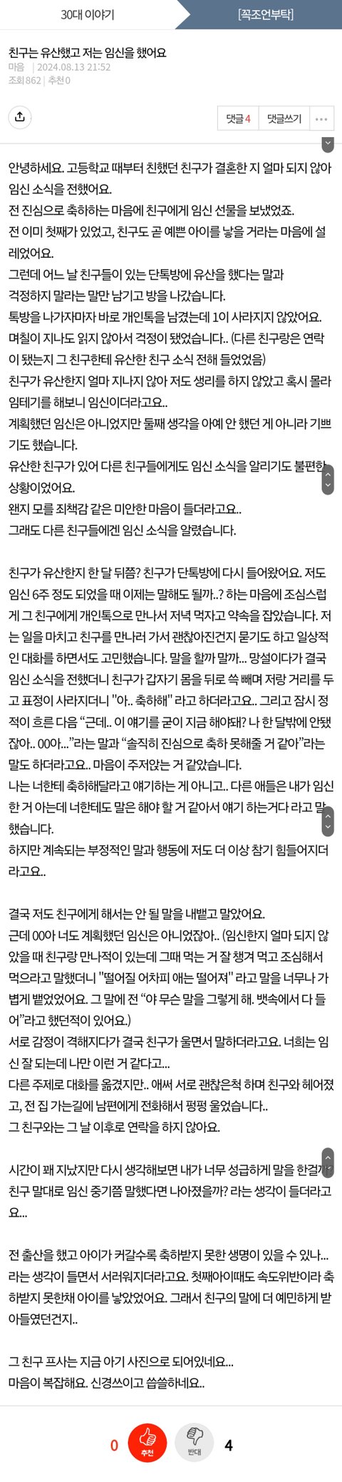 친구한테 평소 열등감 있었는데 유산했다니까 혼자 신나서 친구들에게 떠벌리고 다닌 것 같음ㅋㅋ 친구가 유산했다는 소식 한달도 안 지나서, 안정기도 아니고 임신한 티도 안 나는 임신 6주차에 저러고 싶을까? 사람 같지도 않은 인간들 많다. 배가 불러오는 시기에 만나도 저절로 알게 됐을 텐데. 근데 이미 친구들 사이에서는 쓰니 뒷말 오가고 있을듯. 사람들은 말을 안할 뿐이지 생각이란 걸 하고 산단다. 절대 가까이 하기 싫은 유형임. 가까이 하면 할수록 본인 열등감에 피해만 끼치는 유형.