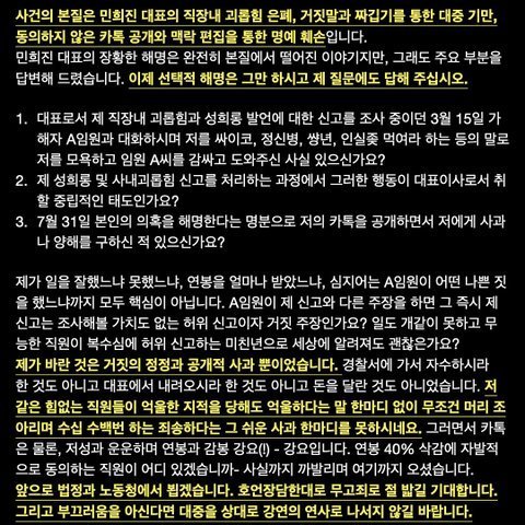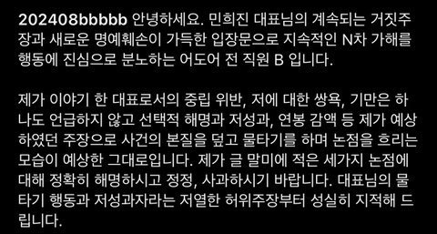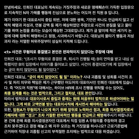 뭔 헛소리야 B가 처음 올린 글 기억 안남? 그땐 비문 오지게 많고 내용도 중언부언이었어 이건 딱 봐도 변호사가 만져준 글이고 그마저도 틀린부분이나 설득력 없고 증거 제시 못해서 무의미한 부분이 많은데 뭘 글은 이렇게 쓰는거라며 올려치고 자빠졌냐