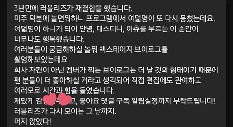 이렇게까지 나서서 떡밥을 던지고 스포를 뿌리는데 어떻게 확신을 안 해욬ㅋㅋㅋㅋㅋㅋㅋㅋㅋㅋㅋㅋㅋㅋㅋㅋㅋㅋㅋㅋㅋㅋㅋㅋㅋㅋㅋㅋ(근데 애초에 해체를 한 건 아니긴 했음 울림 계약 만료지)