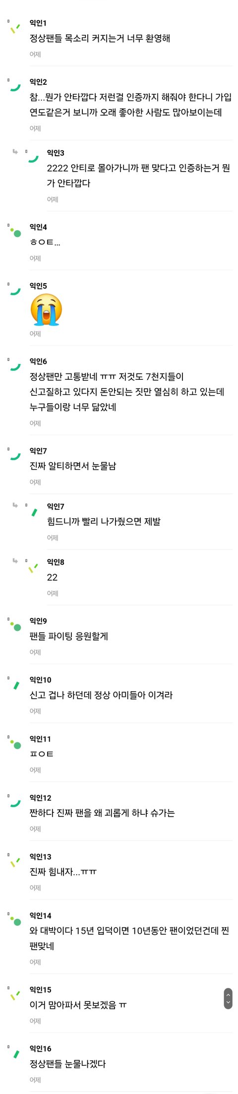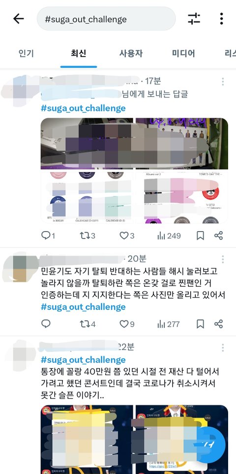 저 챌린지에 참여한 사람중 하나인데 진짜 탈퇴 외치는 사람들은 방까, 안티, 타팬 짓이라고 여태까지 처 패온게 빡쳐서 굿즈 구매 내역들, 오프 뛴거 다 인증했음. 막말로 타팬 방까 안티가 왜 탈퇴를 요구하겠냐고.. 방까들은 걍 탈퇴 안 하고 남길 원한다 그래야 합법적으로 욕할 수 있으니까 라고 말을 해도 못 알아 처먹음