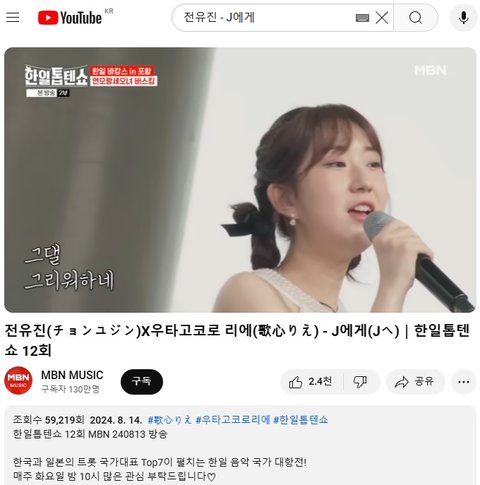 (사진3 설명) 전유진(チョンユジン)X우타고코로 리에(歌心りえ) - J에게(Jへ)|한일톱텐쇼 12회 YouTube MBN 동영상 화면 캡춰