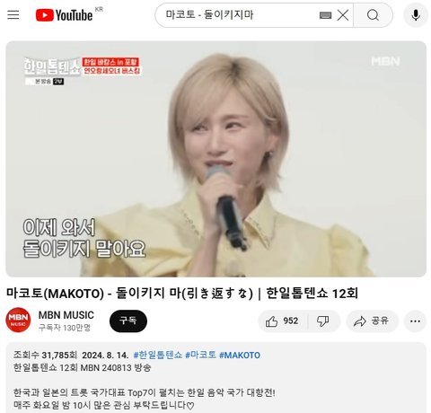 (사진5 설명) 마코토(MAKOTO) - 돌이키지 마(引き返すな)|한일톱텐쇼 12회 YouTube MBN 동영상 화면 캡춰