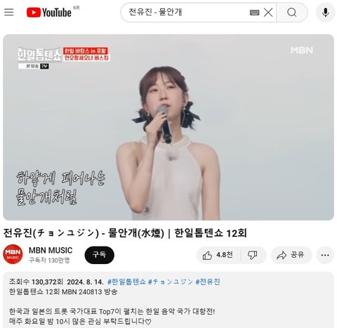 (사진6 설명) 전유진(チョンユジン) - 물안개(水煙)|한일톱텐쇼 12회 YouTube MBN 동영상 화면 캡춰