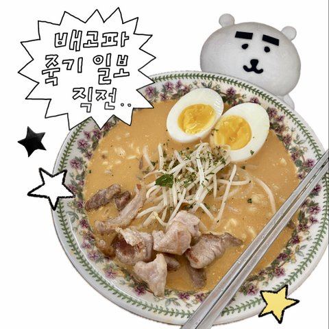 물 500ml에 숙주 1분쯤 삶고 빼준 다음 면 넣고 삶은 다음에 그릇에 면이랑 면수 와르르 부어주고 삶은 숙주 위에 토핑+집에 굴러다니는 고기 구워서 토핑+반숙 계란+있어보이게 파슬리 좀 톡톡 뿌려주면 완성!!!