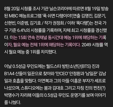 이날 방송된 '푹 쉬면 다행이야'에는 방탄소년단 진이 출연했다. 지난 6월 군 전역 후 첫 지상파 예능 출연이라 더 큰 관심을 얻었다.
