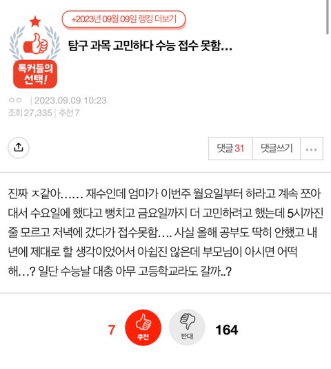 짘쩌 심잔 철렁함 나 반수생인데 ㅅㅂ 수능접수 ㅠㅠ못한줄 알고 진짜 ㅅㅂ 눈물 나올라햇는ㄷ 23년글이엇네.. 와 진짜 ㅅㅂ..ㅠㅠ 어쩐지 수능접수 시작도 안 햇는데..