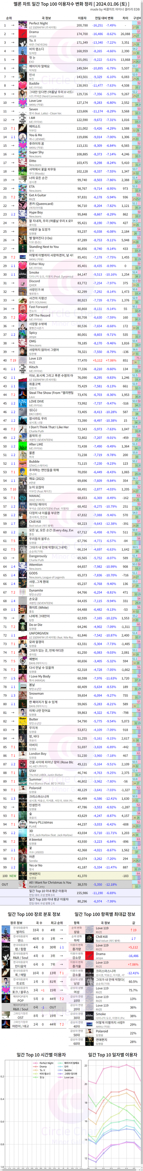 토요일 일간은 토요일12시~일요일12시까지 기록이라 원래 금요일에 붙은 기존곡 이용자수가 빠지는 게 정상인데 첫만남은 치고 올라오는 신곡이라 이용자수가 오른 거 슈퍼레이디만 봐도 신곡이니 혼자 적게 빠진 걸 볼 수 있음