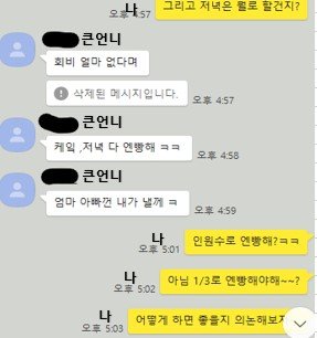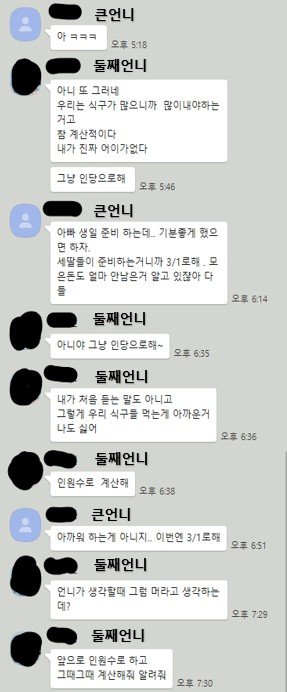그러다 모임돈을 내년에 아빠 칠순에 쓰자고 합의를 하고 그럼 식사비용을 어떻게 할건지에 대해 이야기를 단톡방에서 하던 중 저는 큰언니가 혼자이고 항상 3으로 나누면 큰언니가 혼자인데 많이 낸다는 생각을 하곤 했습니다 그래서 돈 문제인만큼 이번에 3으로 나눠서 할건지 아니면 인원수로 할건지 얘기를 했는데