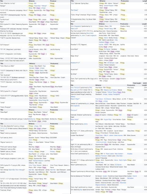 아래는 방탄 노래 작곡가랑 프로듀서진임. 일본 앨범은 추가하지 않았음 근데 일본크레딧이라고 한국 앨범 크레딧이랑 크게 다르지는 않아. 메인프듀는 항상 피독이고.
