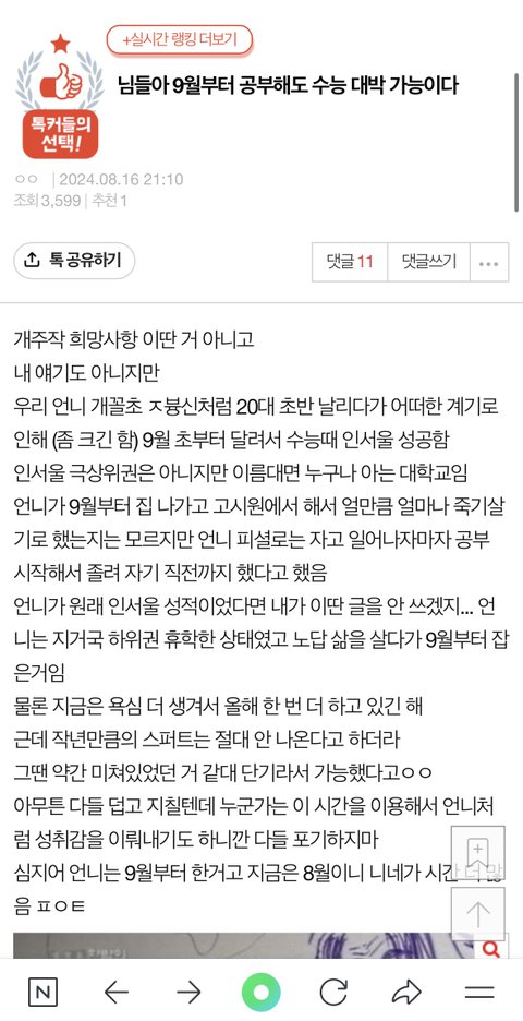 8월부터해서 100일전부터해서~ 어쩌규 이런글이 쌉주작일수밖에없는게 머리가 안따라줘서, 성적이 안나와서가 아니라 고3생활 절반을 날려먹고 놀다가 그제서야 정신차리고 공부할 애들이 거의 없기때문ㅋㅋㅋ 재수학원 다닐때 쌤이해준말 애들 생각보다 공부 진짜 안해..였음 안하는애들은 뭘해도 안하더라