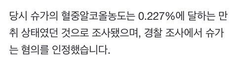 슈가 0.227 만취 운전 경찰에서 인정