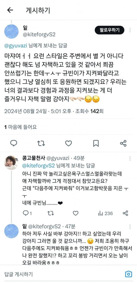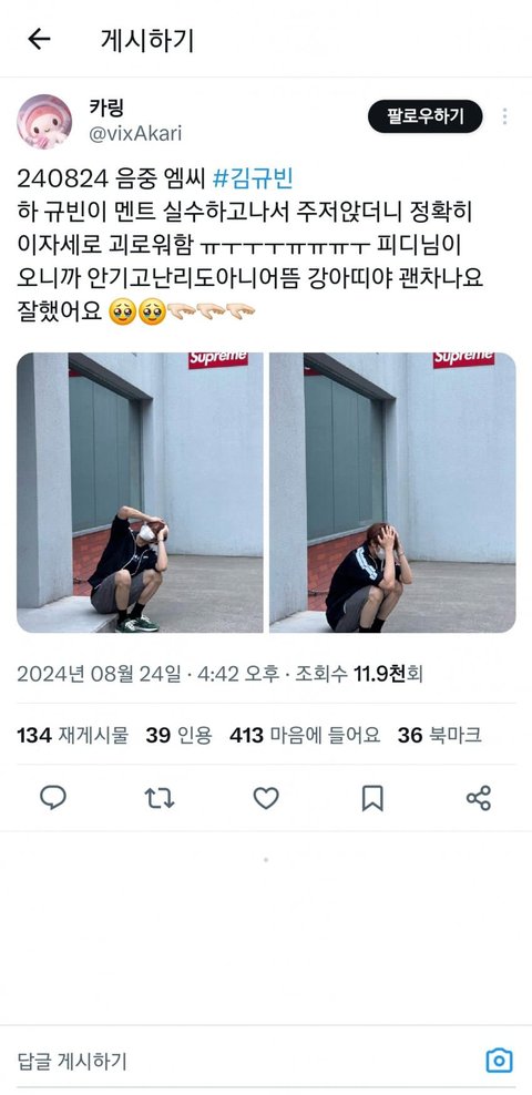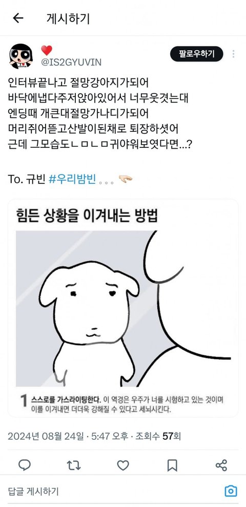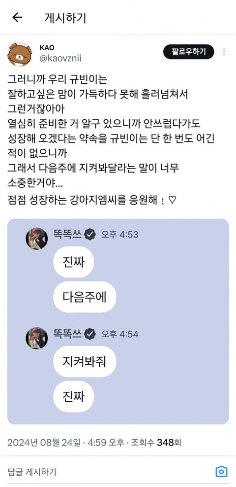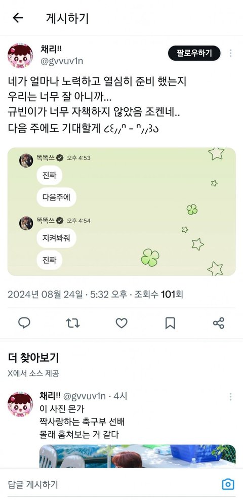 플로버인데, 조금 그렇긴 했지만 그럴수도 있지란 생각. 군대에 새로 전입 온 신병이 실수했다고 뭐라고 그러면 비판이 아니라 비난이 되는거고, 누구나 대학이나 회사 신입일 때 실수할텐데 이때 남을 용서하지 않은게 나한테 돌이올 수도 있다 생각함. 미워할 시간에 프로미스나인 한번 더 보는게 좋음. 제베원 in bloom 좋아합니다 ㅎㅎ 염치없지만 저희 애들한테 성적 조금만 더 좋게 주고 싶어요. 슈퍼소닉 한번씩만 들어줘요 ㅠㅠ