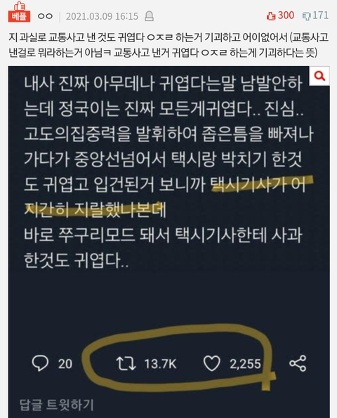 “우리 정구기 술 취해서 헤롱헤롱 한 상태로 코너돌다 자빠진거 왜케 귀여워 ㅠㅠ“ ㅇㅈㄹ 하는 글로 도배했을거 아님