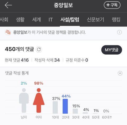 관련기사에 댓글성비 봐 한남들 평소에 여혐댓글 ㅈㄴ달고다니다가 지들 불리한 기사엔 바퀴벌레마냥 흩어짐