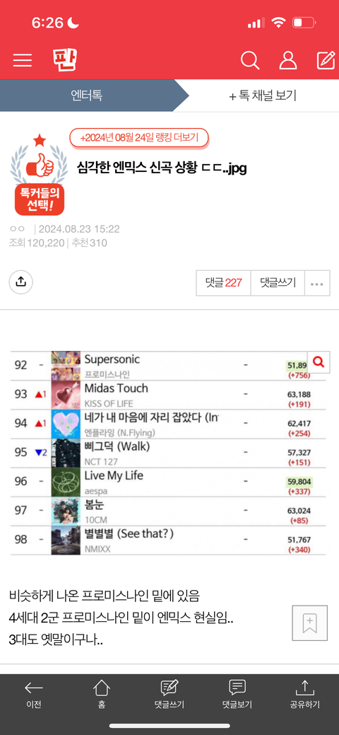 참 아에뉴르빠들 수준 보인다 엔믹스 노래 안좋기로 유명한데 신곡 나오니까 그 팬들이 다 모여서 억까하네 ㅋㅋㅋㅋㅋ 엔믹스 노래 안좋다, 팬들이 억지 바이럴한다, 타이밍이 르세라핌 노린거 같다 같은 억까부터 망돌이다 죽어라 해체해라 능력없다 등등 되도않는 무지성 비난까지
