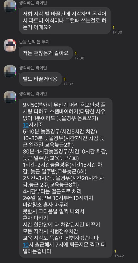 근데 그동안 없던 지각,무단결근 벌을 오늘 갑자기 정했나봐 카톡으로 인턴들끼리 정한 벌을 정리해서 보내줬더라 보자마자 정말 퇴사하고 싶다는 생각밖에 안들어..이게 맞는거야?난 무단결근으로 현재 이번달은 월차발생 안되고,급여차감,디자이너로 승급할때 보는 시험점수 차감된 상황인데 오늘 정한 지각,무단결근 벌을 추가로 포함시킬거래
